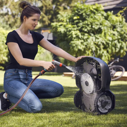 ボディの外側と下側をガーデンホースで洗えます。また、 付属のメンテナンスツールで、カバーを取り外し清掃することができます。(水洗い可能なのは、IPX5の機種のみです。水洗いはチャージステーションから離れたところで行ってください)