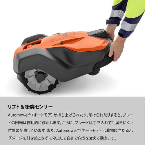 Automower™ (オートモア) が持ち上げられたり、傾けられたりすると、ブレードの回転は自動的に停止します。さらに、ブレードは手を入れても届きにくい位置に配置しています。また、Automower™(オートモア) は異物に当たると、ダメージを引き起こさずに停止して自身で向きを変えて動きます。
