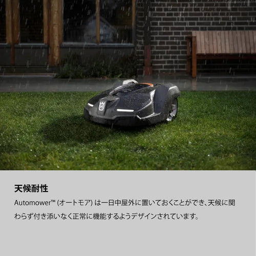 Automower™ (オートモア) は一日中屋外に置いておくことができ、天候に関わらず付き添いなく正常に機能するようデザインされています。