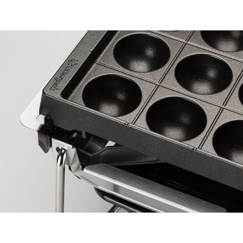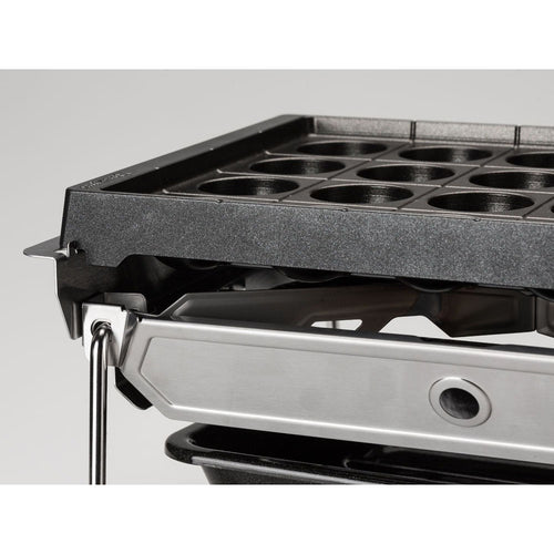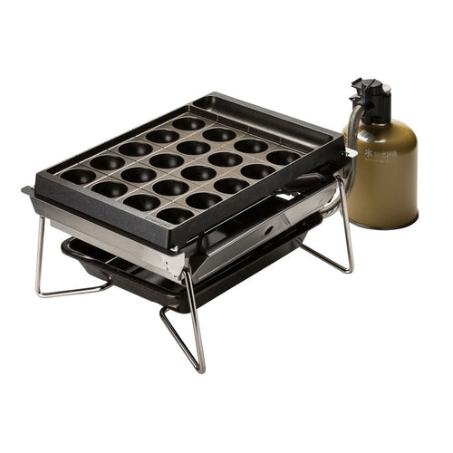 特長:「雪峰苑」は、蓄熱性の高い鋳鉄のグリドルで、分厚いステーキもおいしく焼ける、本格的な焼肉バーナー。 余分な脂が水皿に落ちる構造によって煙の発生を最小限に抑えました。また、網の清掃などの手間がかからず、ガスを燃料にしているので、後片付けが簡単な点も魅力。輻射熱の影響が少なく、卓上でも使いやすい製品です。 そして、この「雪峰苑」の特性を生かした新たなオプションとして「雪峰苑 たこ焼きプレート」が誕生しました。軽くて扱いやすいアルミ素材を採用。 プレートの端まで切り溝を施してあるのがポイントで、生地を流し込んだ後も仕切りが分かりやすく、初心者でも大玉のたこ焼きがきれいに作れるようにこだわりました。 そのほか、プレートの形状を活用して、おつまみからスイーツまでアイデア次第で多彩な料理が可能です。