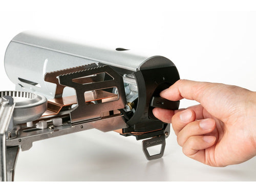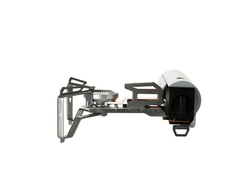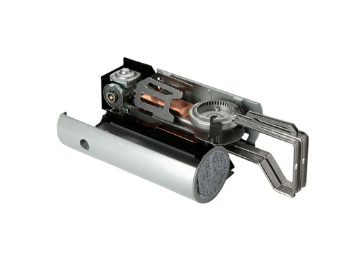 カセットコンロのなかで大きく面積をとる五徳部分を、CB缶をセットする本体部分に格納することで、無駄のないスッキリとしたフォルムを実現。
