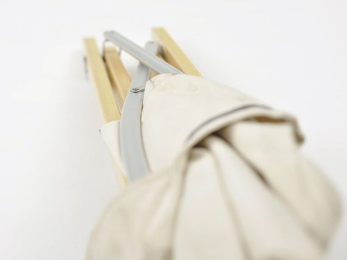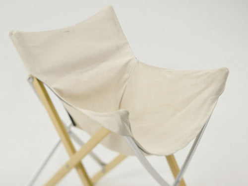4本のメイン脚は竹の集成材、前後にアール曲線をつけたアルミフレームをX字に組み合わせました。強度を維持しながらデザイン的にも美しく設計しました。座布に丈夫な6号帆布がしっかり人を包みます。家のベランダや庭にも最適デザインです。高い背もたれのロングタイプの用意しています。