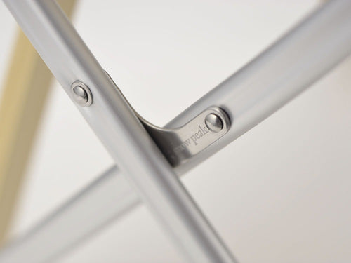 アルミフレームの接合部にV字型パーツを採用、座面下の幅が広がり窮屈さを解消します。