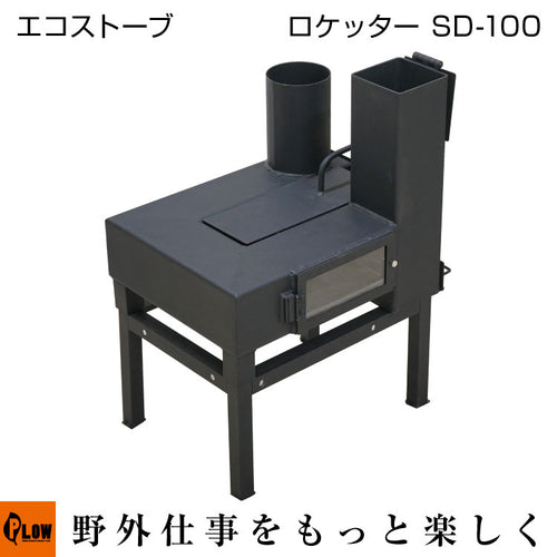 3.ダクトが暖まると上昇気流が発生、焚口から空気を吸い込み木を勢いよく燃焼させます。火はロケッター内部を通り、ダクト方向に向かって流れます。温度が上がるほど煙の量は減少していきます。
