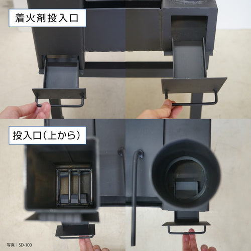 2.焚口で薪などの木質燃料に焚き付けします。