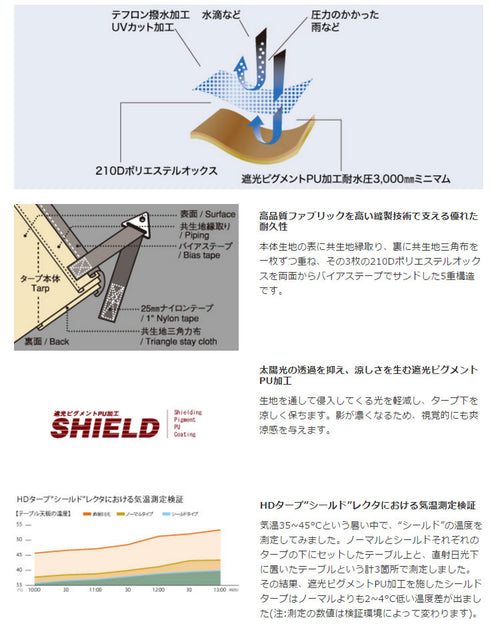 ● 材質:本体/210Dポリエステルオックス、遮光ピグメントPUコーティング耐水圧3,000mmミニマム、UVカット加工・テフロン撥水加工(初期撥水100点、5回洗濯後90点)