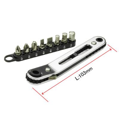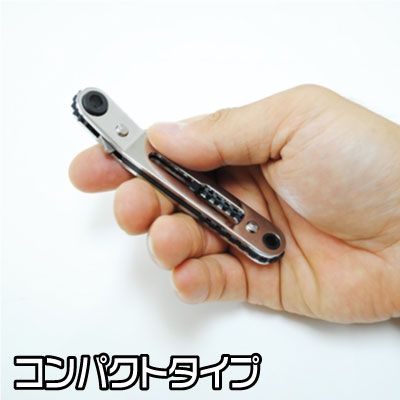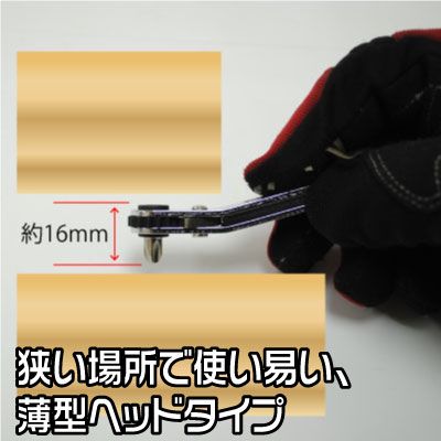 薄型で、角度の付いたラチェットハンドルとショートビットのセットです。