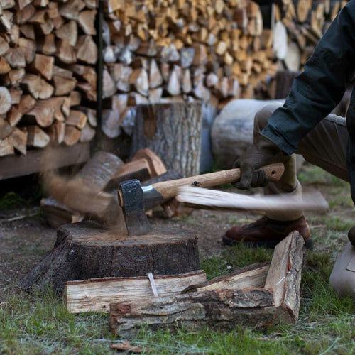分厚く重い斧身と短い柄がコントロール性を高め、小型薪割りとして焚き付け作りにも重宝します。