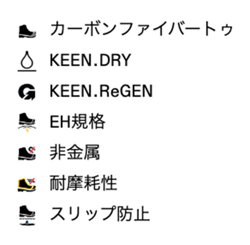 レザーよりも耐摩耗性に優れたTecTuffボンデッドコーティングのアッパー、高いエネルギーを還元する《KEEN.ReGEN》のミッドソール、スチールよりも15%軽量の《CARBON-FIBER SAFETY TOE》など、万能のスペックを搭載。スニーカーの運動性能とワークブーツの耐久性を、ハイレベルで兼ね備えたシューズのひとつの完成形がここに誕生した。