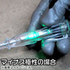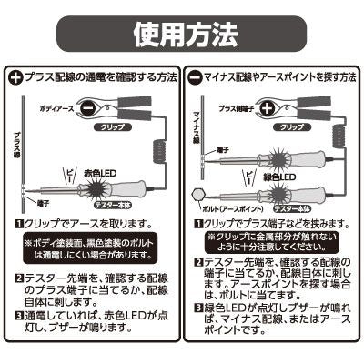 確認箇所が通電していればブザー音が鳴り、プラス極性の場合は赤色LEDが点灯し、マイナス極性の場合は緑色LEDが点灯するので、極性が一目でわかります。
