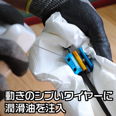 アウター、インナーワイヤーを本体で挟み込み注入口から潤滑油を注入するだけで、インナーワイヤーに直接潤滑油を送り込むことができます。
