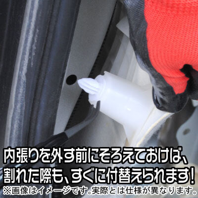 内張りを外す際、パネルの裏側ついているクリップは割れてしまいがちです、内張りを外す作業の前にそろえておけば、割れてしまった際も、すぐに付け替えて、作業が中断しなくて済みます。