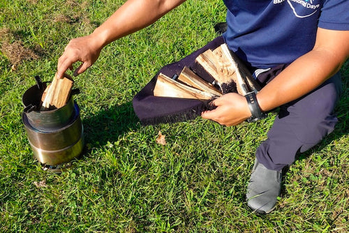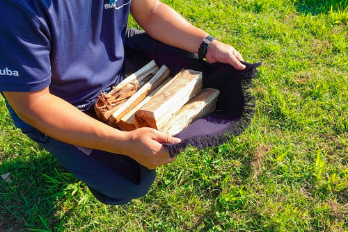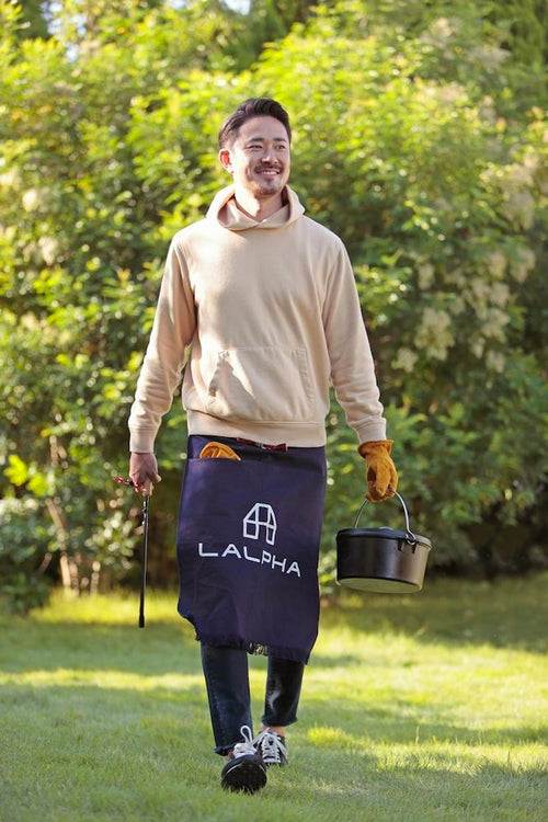 焚き火の火の粉から守り、調理時の汚れ防止や薪運びも出来る便利な前掛けです。