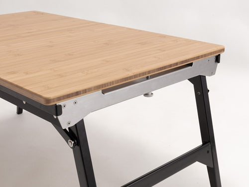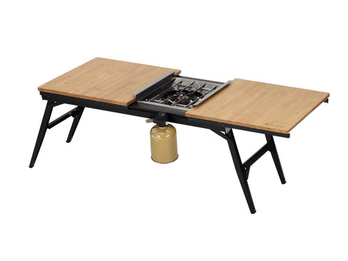 天板を左右にスライドさせるとIGTフレームが出現し、IGTユニット製品を設置することができます。本製品一つで調理と食事のスペースを同時に設えることができる「エクステンションIGT」。キャンプでは、快適性を求めるほど多くのテーブルが必要となり、テーブルの数が増えるほど準備・撤収・車への積載時の負担が増えてしまいます。調理と食事のスペースを同時につくれる機能的で程よいサイズのテーブルがあれば、荷物を減らしながら快適なキャンプができると企画されたアイテムです。当社のIGTユニットサイズの製品がフレーム部に組み込んで使用していただくことができます。基本ユニットサイズは1ユニット、2ユニットの設定です。片側の天板をスライドさせると中央に1ユニットサイズのIGTレールが出現し、左右両方の天板をスライドさせると2ユニットはめ込むことができます。様々なユニットを選択し、組み合わせることが可能です。