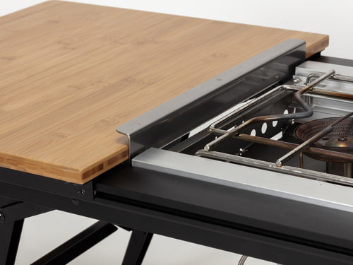 ※炭火を利用するBBQボックスを組み込む事はできません。火の粉や爆ぜた炭によって天板が焦げる原因となる可能性がございます。