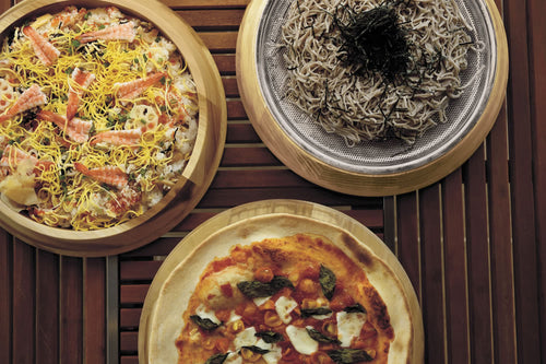 パーティー料理に最適な大皿セット。ザル、ボウル、木製大皿から構成されており、組み合わせを変えることで、ピザ、ざるそば、寿司桶など、様々な大皿料理に対応します。