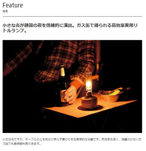 小さな炎が静寂の夜を情緒的に演出。ガス缶で得られる高効率実用リトルランプ。