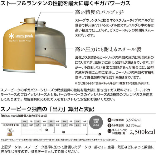 ガスカートリッジを倒立させて装着する場合、液化ガスを液体のままガスカートリッジから取り出すシステムなので、気化熱によるガスカートリッジの温度低下が少なく、最後まで安定した燃焼が続きます。ストーブは高出力を維持します。