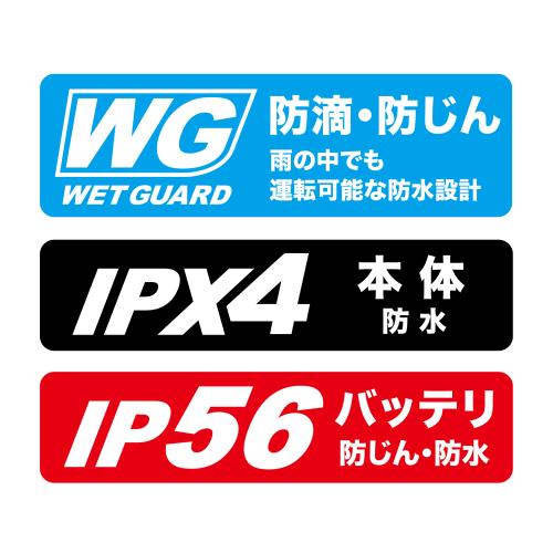 | 防じん・防水 | IPX4 (バッテリIP56) |