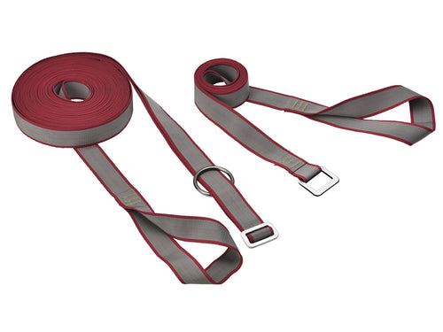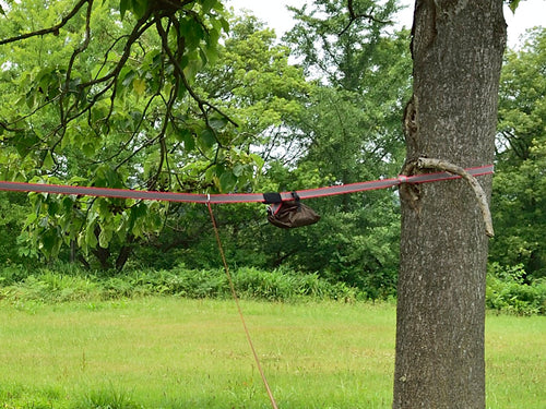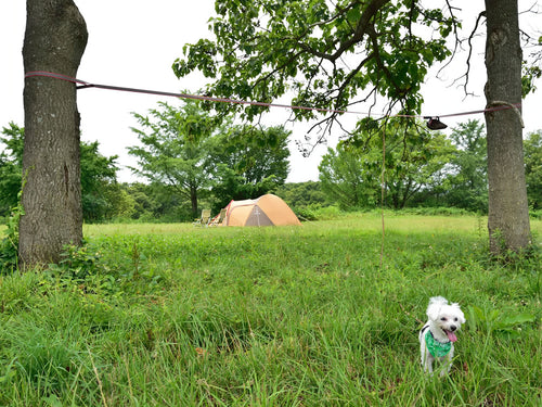 キャンプ場でペットの行動範囲を広げる道具。木々の間にベルトを繋ぎ、リードを接続することでその間を自由に動くことができます。