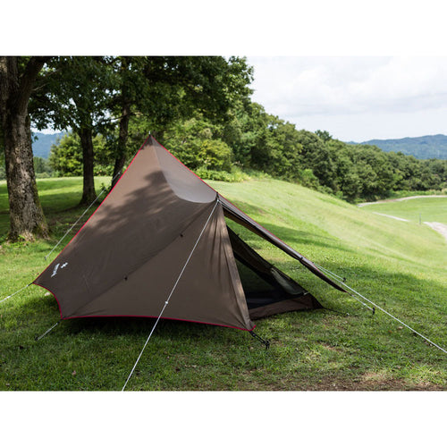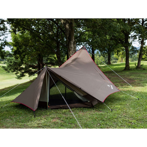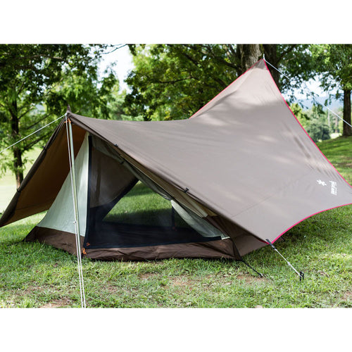 特長:一人の時間を贅沢に過ごす、ソロキャンパーのための快適ソロテント。 キッチン・リビングとして必要十分な前室スペースと、既存のソロテントに劣らない屋内空間。長さの違う2本のポールを前後に配置することにより、天井の高い、ロースタイルにぴったりの前室空間を創出しました。 チェアやテーブル、その他のキャンプギアも、ゆとりをもって配置が可能です。タープは変形六角形にすることで、後方部分にも雨避けの役割を果たしてくれる後室ができ、後方からの出入りも可能に。 インナーテントは2点でフライシートに吊り下げて、コーナーを固定するだけで設営完了。後方のポールによって室内高が保たれ、大人一人が過ごすのに快適な広さに設計しました。フルパネル/フルメッシュにアレンジ可能で、多様な天候に対応。収納サイズはコンパクトに抑え、コンパクトカーやバイクへの積載もラクラク。さらにタープは単体でも使用可能です。 ひとりの時間をより豊かに。ソロキャンプの楽しみの幅をより大きく広げてくれます。