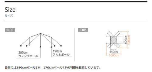 ●セット内容: タープ本体、自在付二又ロープ(×2)、自在付ロープ(×8)、キャリーバッグ、ポールケース、ペグケース、取扱説明書