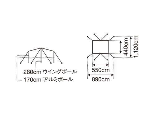 | セット内容 | タープ本体、自在付ロープ(二又用10m×2、3m×8)、ポールケース、ぺグケース、キャリーバッグ |