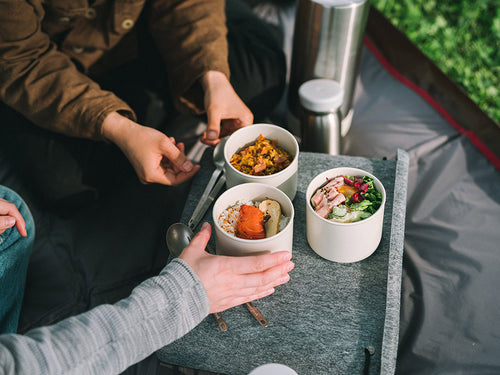 磁器の器に盛った家庭の料理を、真空断熱のケースに入れて持ち出せるシステムランチウェア。