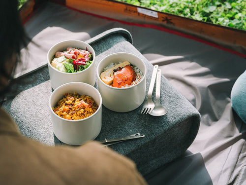 磁器の器に盛った家庭の料理を、真空断熱のケースに入れて持ち出せるシステムランチウェア。