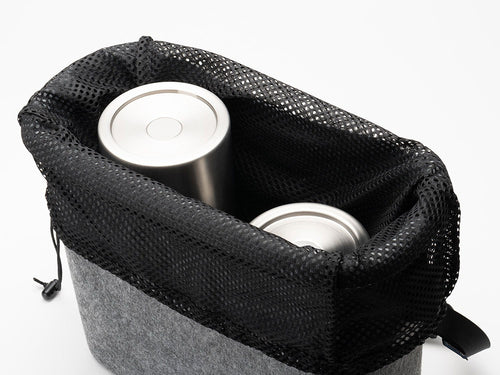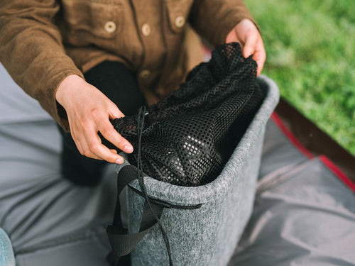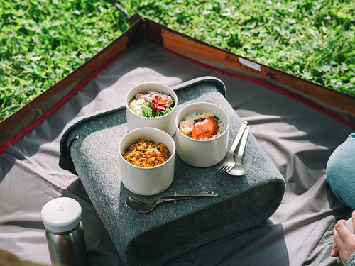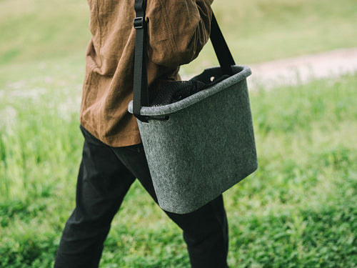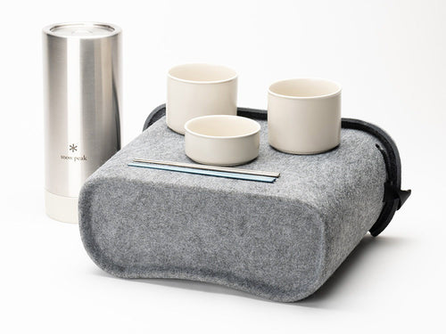 持ち運ぶ際は、丸みを帯びた形状が体にフィットします。食事の際は、横に倒すことにより、テーブルとして使用できます。フェルト素材で優しい質感に仕上げました。