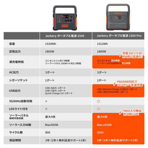Jackeryの大容量・高出力モデルの「ポータブル電源 1500」に高速充電を実現するUltra-Charging Systemを搭載したProモデルが登場。ホットプレート、電気ケトル、ドライヤーなど、自宅の家電がほぼ全て使用できるので、キャンプ、車中泊を快適に過ごせます。