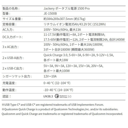 | 3xAC出力 | 100V~50Hz/60Hz,1ポート最大18A/1800W, 3ポート合計1800W(瞬間最大3600W) |