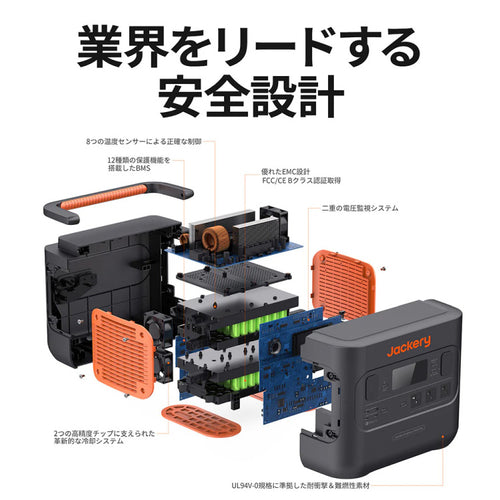ポータブル電源の安全性を高めるために、8基の温度管理システムと2つのスマートチップによる高度な温度制御を実現しました。さらに特許取得済みのマルチダクト設計によって従来モデルより冷却効率が30%向上。また、0.9mから3度の落下に耐える耐衝撃設計、米国UL規格で最高の94V-0の耐火素材を採用することで、業界をリードする安全性を実現しました。