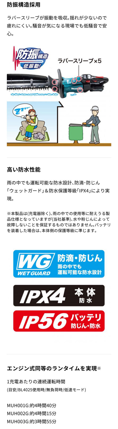 | 防じん・防水 | WG IPX4 (バッテリIP56) |