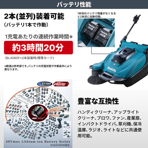 1本で作動し、残量がなくなると自動で2本目へ切替。約3時間20分の連続運転が可能(BL4080F×2本、標準モード時の参考値)。