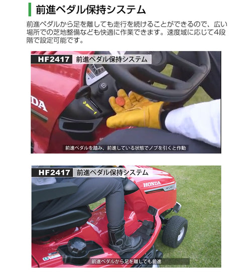 平地での速度域に合わせて4段階で設定可能で、前進ペダルから足を離しても走行を続けることができるので、広い場所の芝地整備などでの快適な作業に貢献します。