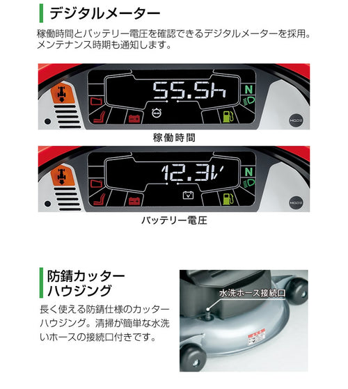 コントロールパネルは「稼働時間」や「バッテリー電圧」などを確認できる液晶のデジタルメーターを採用。着座位置からの視認性に配慮するだけでなく、メンテナンスタイミングの通知機能により、適切な機材の管理をサポートします。