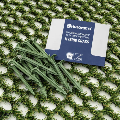 ハイブリッドグラスはロボット芝刈機用に狭い斜面でのグリップを強化します。ロボット芝刈機の停止、スピン、斜面での絡まりなどのトラブルを防ぎます。1メーター四方のハイブリッドグラスに、16本の杭が付属。