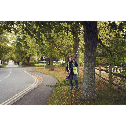 パイプが伸びるテレスコピックタイプのバッテリー式ポールソーで、バー無しで最短の全長は、2.6mですが、最長バー付きで4m、作業者が手に持つと高さ約5m に達します。