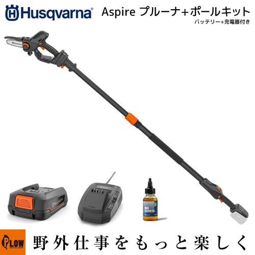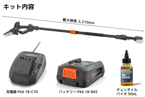 Aspire P5-P4A にポールを付けたポールソー。ポールを外してプルーナとしても使用できます。樹木の剪定や庭木の伐採、ちょっとした大工仕事に最適です。ポールソーの最長が 2,210mm(伸縮式・ブレード含む)なので、高い枝の剪定も楽々。実績のあるチェンソーのノウハウを基に開発され、75mm径の枝も簡単に切断できます。工具不要で簡単にチェンとバーを交換でき、滑り止めハンドルと3分使用しないと自動的に電源オフになる安全設計。付属のフックで収納も簡単です。