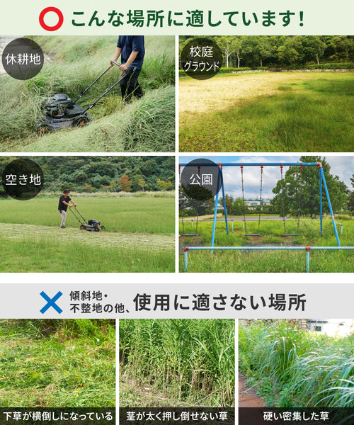 しかし、下草が横倒しになっていたり、茎が太い草や硬く密集した草が生えている場所では、部品の摩耗が早まったり、エンジンが停止する可能性があるため、使用には適していません。ご注意ください。