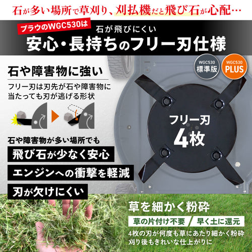 WGC530はフリー刃が4枚装着。刃はトルクの強い外周にあるので力強く草を刈り取ります。デッキ内では4枚の刃が何度も草にあたるため草が粉々になりやいのも特徴です。