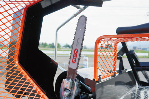 太い木材もラクにカットできる刃渡りが長い450mmのチェンソーを標準装備。プロセッサー本体にカッターハンドルを装備しているのでチェンソーに直接触らず安全に作業が行えます。