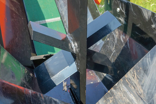 破砕する際のニーズにあわせ、4ッ割りと6ッ割りができるウェッジを付属しました。本体にあるレバーで高さ調節を行うことにより太さの異なる木材でも中心で破砕することが可能です。最も下げると2ッ割りにすることも可能です。