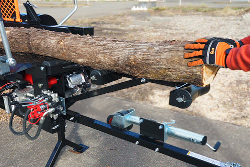 重い丸太を小さな力でスライドできるログローラー搭載。ローラーが回転するのでスライドさせにくい木材もラクにスライドさせられます。また用途にあわせオプションのログローダーも別途販売しております。