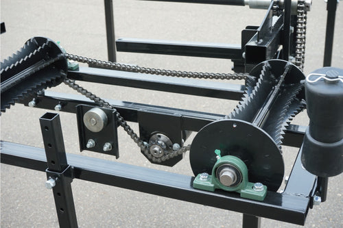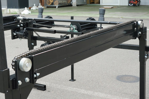 油圧で稼働する搬送チェーン。頑丈で太いチェーンを使い耐久性にも優れているのが特徴。油圧レバーの操作も少ない力で作業が行える。