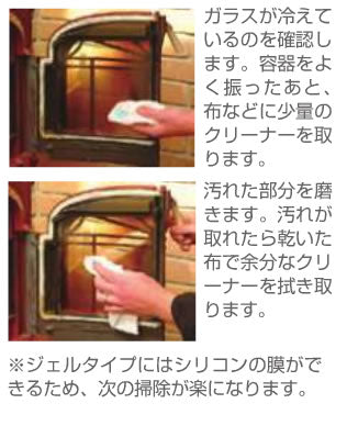ドアのガラスにこびり付いたタールやススの汚れを落とし、耐熱ガラスの透明感を保ちます。頑固な汚れにはジェルタイプがオススメです。