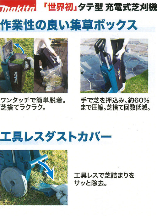 「世界初」タテ型 充電式芝刈機●作業性の良い集草ボックス
