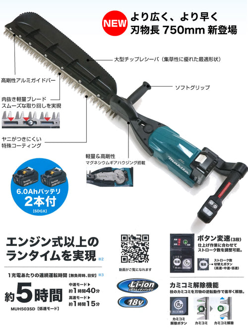 マキタ 充電式ヘッジトリマ 750mm 片刃式 18V【MUH753SDGX】 バッテリBL1860B×2本・充電器DC18RF付