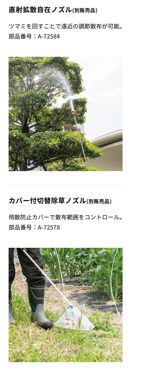 | 標準付属品 | I型2頭口ノズル 除草ノズル 噴霧管ホルダ 計量カップ 背負いバンド |